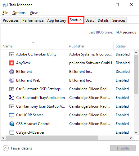 إصلاح 1: تعطيل بدء التشغيل التلقائي من LogiLDA أو Apoint. اضغط على Ctrl + Shift + Enter لفتح نافذة مدير المهام Task Manager. الآن ، انتقل إلى علامة التبويب "بدء التشغيل Startup".